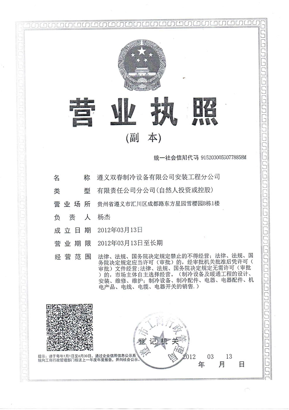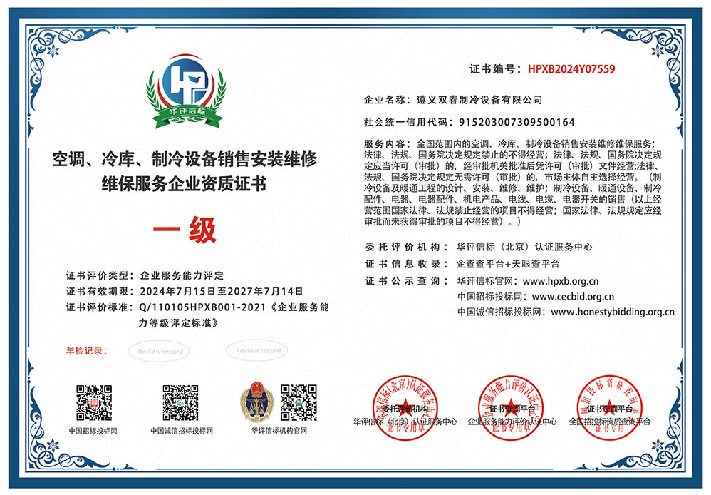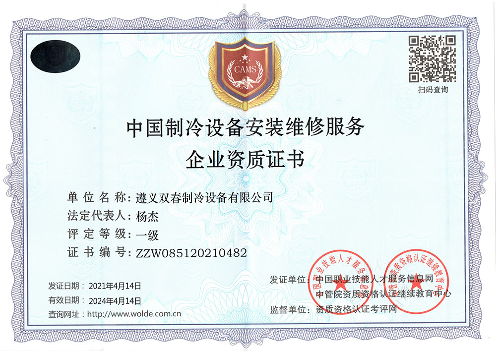 空调、冷库、制冷设备销售安装维修维保服务企业资质证书
